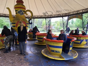 Danach gibt es tatsächlich noch eine Attraktion, die man benutzen kann – das Wassertassen Karussel. Allerdings muss man es von Hand anschieben, was aber den Spaß nicht mindert. Einige der Besucher erinnern sich wohl noch an ihre Kindertage, wenn sie sich sofort nach Betreten des Parks und kurz vor der Schließung auf diese Attraktion stürzten. Das Karussell liegt direkt hinter dem ehemaligen Haupteingang.