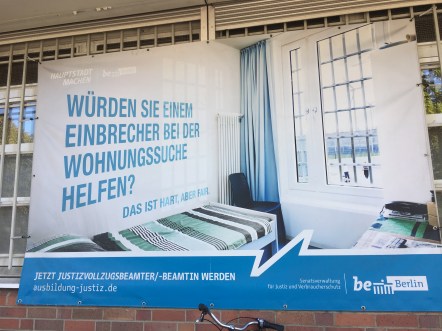 Ja, das ist wirklich gemein, schmutzig und infam, wenn man als Titelbild für diese Geschichte die Justizhaftanstalt in Charlottenburg-Nord zeigt. Als ob das typisch für diesen Stadtteil wäre. Ist es aber, da sie nicht einmal das einzige Haftgebäude ist. Gleich gegenüber liegt die Jugendstrafanstalt. Die ist aber nicht so fotogen. Hat dafür aber ein witziges Schild an der Wand hängen, das so aussieht: