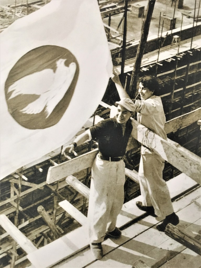 Nach genau vier Jahren komme ich an den Ort zurück, wo alles begann. Dort habe ich zum ersten Mal das obige Foto gesehen, welches Edith auf einem Gebäude der damaligen Stalin Allee zeigt und eine bewegende Geschichte in Kurzform gelesen: geboren 1935 im Nazi-Deutschland, als Kind zwangsverschickt nach Pommern, mit Oma und Cousine nach Ende des Weltkrieges nach Berlin aufgebrochen in eine ungewisse Zukunft. Als eine der ersten vier Maurerlehrlinge auf der Stalinallee gearbeitet. Danach Architektur studiert und an vielen wichtigen Gebäuden der DDR-Hauptstadt mitgewirkt. Schließlich ein Fluchtversuch, der misslang und Zuchthaus. Ich hatte es mir in den Kopf gesetzt, diese Frau zu finden, wenn sie denn noch lebt. Was mir nach über fünf Monaten wirklich gelungen ist, obwohl ich nicht einmal ihren wirklichen Namen kannte. Seitdem treffen wir uns einmal im Monat. Sie erzählt mir aus ihrem Leben, und ich publiziere das als Fortsetzungsgeschichte in meinem Blog allstreetsofberlin.org. Heute werde ich einige Episoden aus ihrem bewegten und ereignisreichen Leben erzählen und freue mich, dass es genau dort stattfindet, wo ich auf ihre Geschichte aufmerksam wurde. Wir Ihr sicher verstehen werdet, bin ich ziemlich aufgeregt. Aber eigentlich gibt es keinen Grund dafür, denn Edith B. wird anwesend sein und mich unterstützen.
