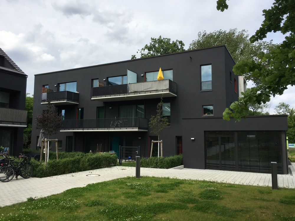 Gleich neben der Tuschkastensiedlung haben nun moderne Architekten begonnen, einen völlig entgegengesetzten Baustil umzusetzen. Hier sind die Gebäude einheitlich schwarz oder grau, wohl um sich von der wunderschönen Umgebung deutlich abzusetzen.