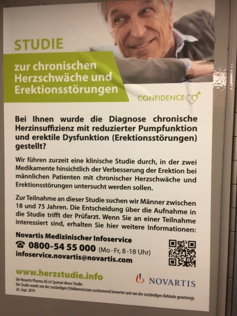 Die U-Bahn ist der ideale Aufenthaltsort, wenn man sich etwas dazu verdienen möchte. Ständig gibt es dort Angebote für Menschen mit seltenen Krankheiten, für die ein neues Präparat getestet werden muss. Egal, ob Erektionsstörungen, Übergewicht, Diabetis- bedingte Sexualschwäche oder übermäßige Transpiration: es gibt immer eine Belohnung für die Teilnehmer. Je nach Risiko kann das stark schwanken. Aber die Auswahlkriterien sind streng. In aller Regel muss man gesund sein. Also vor dem Test. Bei Erektionsstörungen können nur Männer mitmachen. Und das im genderkorrekten Berlin. Wenn man aber zum Beispiel an Übergewicht leidet, darf man die letzten drei Monate nicht zugelegt haben. Da kann ich jetzt keinen Anreiz für Übergewichtige erkennen, die doch die Gewichtszunahme verhindern wollen. Aber egal. Wenn ihr das nächste Mal mit der U-Bahn unterwegs seid, gibt es bestimmt ein passendes Angebot zur Taschengeld Aufbesserung.