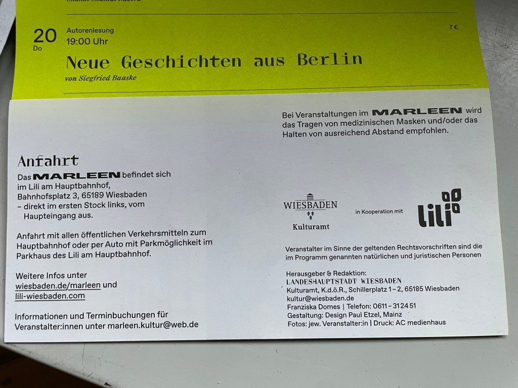Die Veranstaltung im Marleen findet um 19 Uhr statt. Das Theater befindet sich im Liliencarree, einem Einkaufscenter gegenüber dem Hauptbahnhof Wiesbaden.
