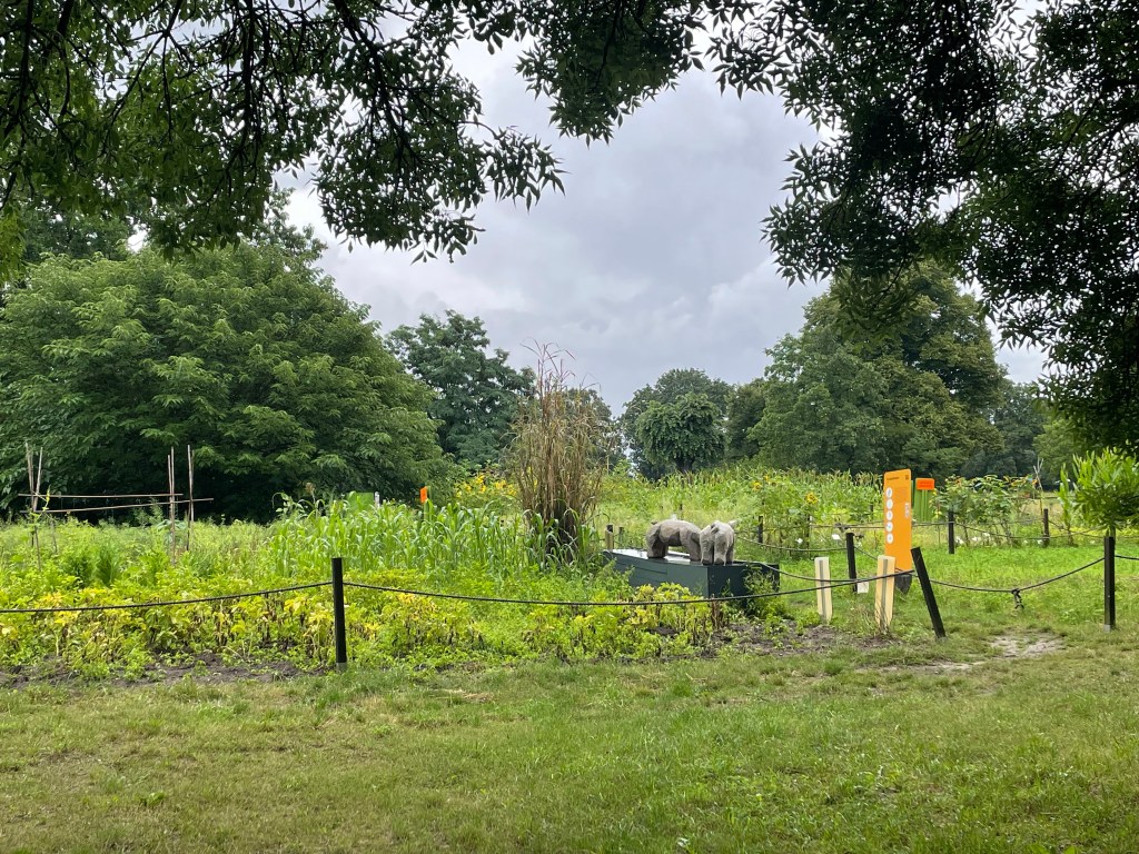 Der Botanische Volksgarten hat mein Interesse geweckt. Wie der Name schon andeutet, steht er er jedem Besucher kostenlos zur Verfügung. Er kommt nicht so wissenschaftlich daher. Nicht an jeder Pflanze ist ein Schild mit lateinischem Namen angebracht. Dafür demonstriert er aber überdeutlich das Ernährungsproblem der heutigen Zeit. Auf einer Fläche von genau 2000 Quadratmetern sind die Nahrungsmittel der gesamten Welt zu finden. Die Zahl wurde so gewählt, weil der heutigen Menschheit etwa genau diese Fläche pro Kopf für Ernährung zur Verfügung steht. Das hört sich zunächst einmal ganz ordentlich an. Allerdings ist neben dem Feld ein Tisch aufgestellt. Statt mit Tellern hat man ihn mit runden Fotos gedeckt. Darauf sind verschiedene klassische Gerichte dargestellt, die auf der Welt gegessen werden. Dreht man die Fotos um, so kann man lesen, wieviel Quadratmeter Erde ein einzelnes Gericht für den Anbau der Zutaten benötigt. Ich hätte es niemals für möglich gehalten, dass es zum Beispiel für eine normale Portion Spaghetti Bolognese bereits eineinhalb Quadratmeter sind.