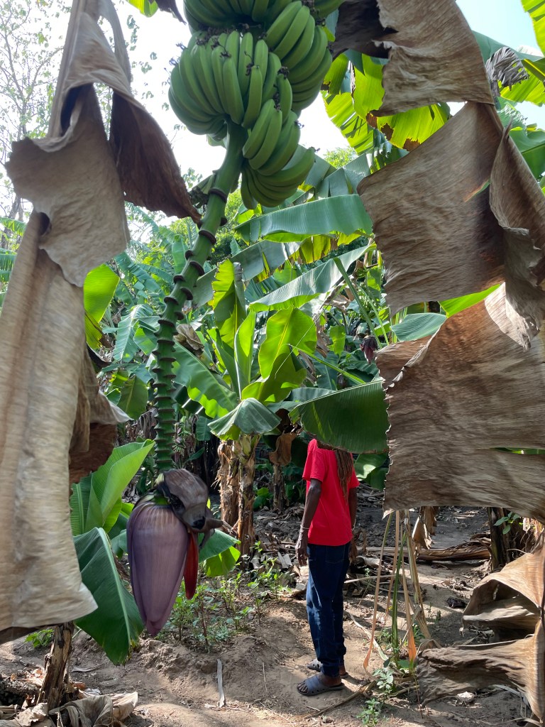 Daniela war den ganzen Tag unterwegs und hat einiges zu regeln. Wenn ich weiter hier rumdöse, fallen mir bestimmt gleich die Augen zu. Das will ich unbedingt vermeiden, damit ich die Nacht durchschlafen kann. Da bin ich froh, dass Samson, der alte Herr, mich einlädt, mit ihm das Paradies zu erkunden. Er spricht zwar kein English, aber wir verstehen uns bestens. An den Ställen vorbei führt mich Samson zu den großen Tieren: Esel und Kühe. Sie werden hier nicht als Nutztiere gehalten. Vielmehr ging es allen schlecht, bevor sie ins Paradies kamen. Daniela hat sie wieder hochgepäppelt, ärztlich versorgt und ihnen einen Platz zum Leben gegeben. Einige Tiere sind blind, aber alle kommen mir freundlich entgegen. Jetzt ist es Zeit für sie zum Weidegang. Einige der Männer führen sie auf eine nahe gelegene Wiese. Die Regenzeit endete erst vor kurzem. So gibt es noch genügend Futter. Samson zeigt mir noch die kleine Bananenplantage. Es ist eine Sorte, die ich noch nicht kenne. Sie bleiben grün, sind aber keine Kochbananen. Erst vor kurzem gab es eine große Ernte, die an Bedürftige verteilt wurde. Jetzt dauert es noch eine Weile, bis wieder Früchte reif werden. Leider bis nach meiner Abreise.