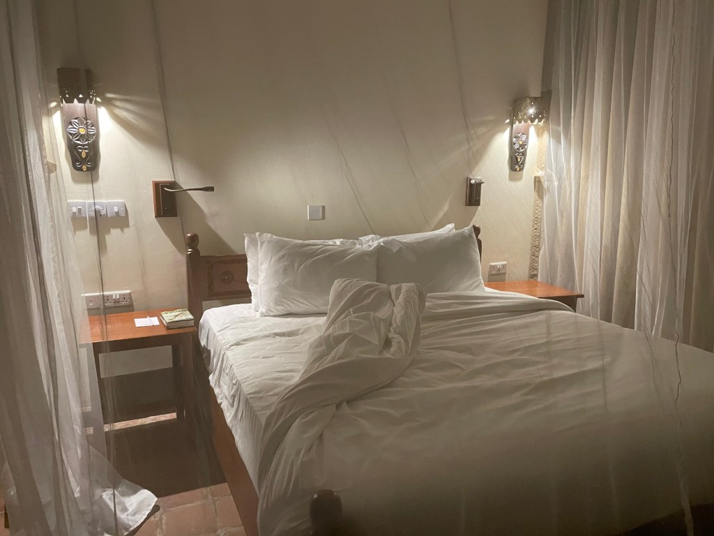 Mit dem Baden wird es heute nichts mehr. Es ist dunkel, das Meer reicht bis an die Hotelmauer. Kein Mensch weit und breit. Das hebe ich mir für morgen auf und gehe schnurstracks zum Abendessen. Es ist eine wirkliche Überraschung. Eigentlich bin ich im Urlaub nicht der Buffet-Typ. Aber erstens bin ich nicht im Urlaub und zweitens sind die Auswahl und Qualität überragend. Ich gönne mir vier Gänge mit Fischsuppe, Vorspeisen, rosafarbenem Rinderfilet und – natürlich Mangos und Passionsfrucht zum Nachtisch. Dazu einen passablen Rotwein aus Kenia. Danach falle ich todmüde in mein traumhaftes Bett, schließe das Moskitonetz und schlafe durch bis zum nächsten Morgen.