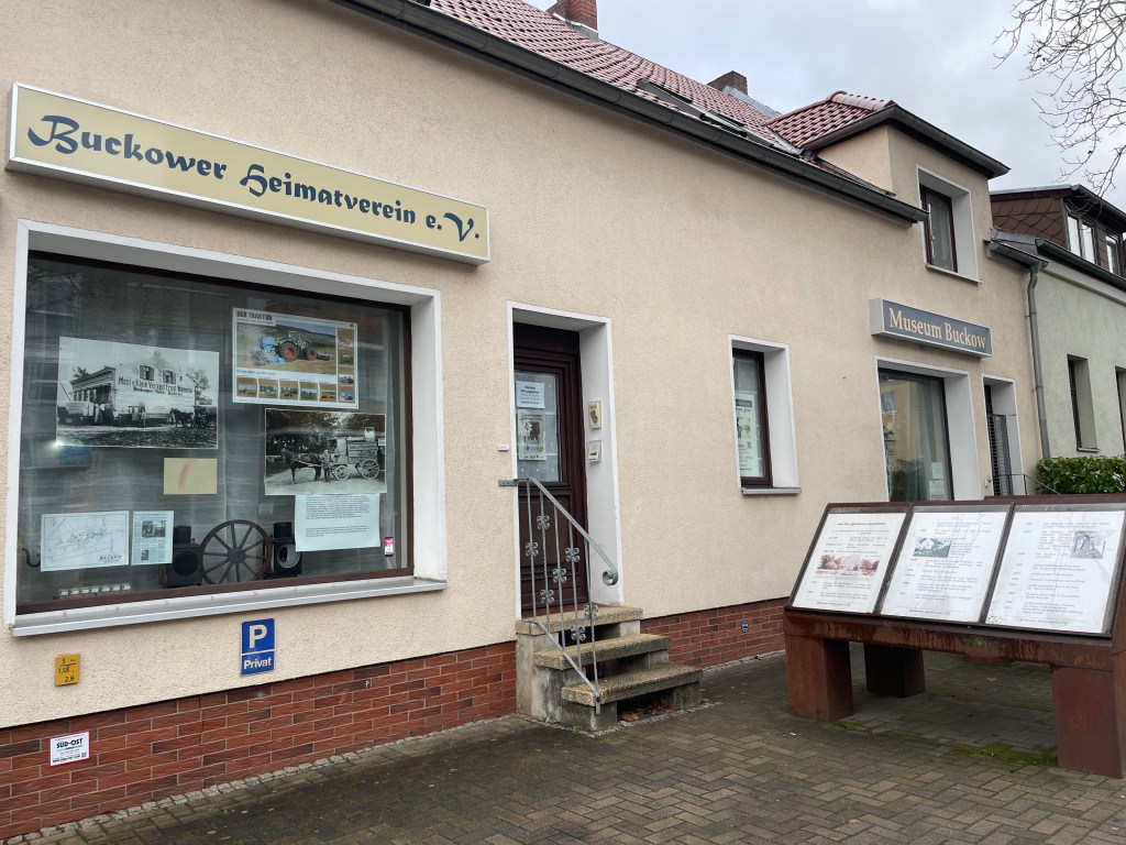 Wenn ich zum Ortsteil Rudow gesagt habe, dass er langweilig sei, so ist Buckow die Steigerung davon. Gottseidank gibt es das Heimatmuseum, das wohl von ein paar Ehrenmitgliedern betrieben wird. Die haben aber offensichtlich nicht viel Zeit, denn das Haus ist sehr selten geöffnet. Nach den Ankündigungen an der Tür etwa einmal im Monat und dann auch nur für drei Stunden. Dennoch erfährt der interessierte Besucher das Wesentliche auf einigen Tafeln vor dem Haus, und für Buckow-Begeisterte gibt es jährlich einen Kalender mit historischen Fotografien.
